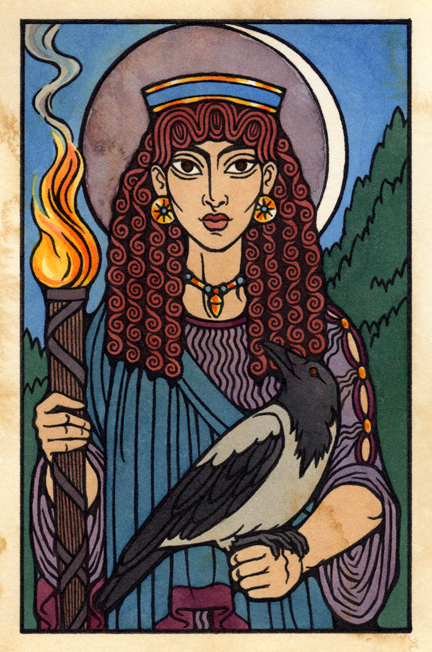 Hera was worshipped in Plataia with nighttime rites and a torchlit procession. She is associated with crows; I have given Her a hooded crow, and She wears clothing and a hairstyle after kore or maiden statues. Done as a commission. |