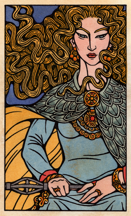 Freyja (‘the Lady’) is the great Viking Goddess of love, beauty, and magic; She is especially associated with the practice of seiðr, a magical practice which could both tell and shape the future. ’Seiðr’ is related to words meaning ‘string’ or ‘cord’, probably relating to the idea of the spun thread of fate, and the characteristic staff used in the practice is a form of distaff, used to hold fibers in preparation to be spun. She is shown here wearing Her falcon cloak, looking inwards, with Her seiðr staff on Her lap. Done as a commission. This design is available on prints through ArtPal. |