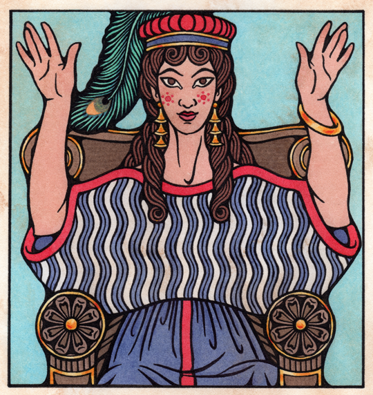 After the so-called 'psi' figurines, so named for the resemblance of the position of the arms to the Greek letter psi, ψ. Shown here enthroned as Queen, with a peacock feather in Her (sort of Mycenaean hat) as that was Her bird. Done as a commission. |