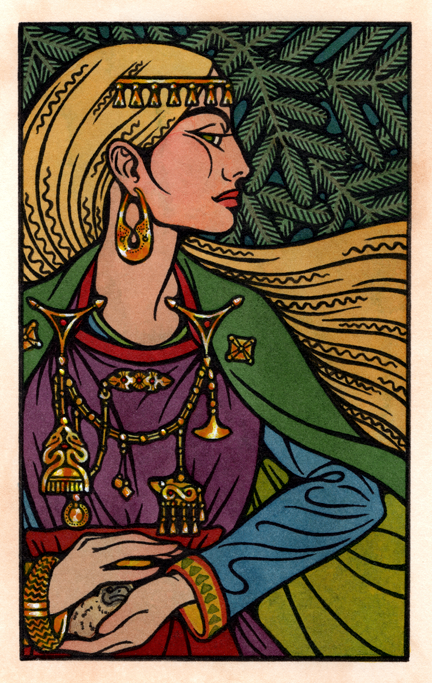 Mielikki is the Finnish Goddess of the forest and the animals within it, especially honored by hunters. It is said that if She appears to a hunter in fine clothing and gold jewelry, She will be generous to him and he will catch a lot of prey. But if She is dressed in rags, with broken sticks for jewelry, She will withhold prey. Mielikki has many names and titles, including Mistress of the Forest, Daughter of the Forest, and Mind of the Forest. Her husband is Tapio, the God of the Forest, and She has two daughters, Tuulikki and Tellervo, both also forest Goddesses, and a son (or another daughter) Nyyrikki, a hunting Deity. She is said to be a healer Who cares for the animals of the woodland, rescuing chicks that have fallen from their nests. In one tale, Mielikki brought up the first baby bear, a very sacred animal in Finnish myth, underneath or within the branches of a spruce tree. She is associated with the colors blue or purple and gold; in a story from the Kalevala She is described as walking across the sky at twilight. I have shown Her here in ancient Finnish dress, with gold ornaments (one of which represents a bear), in front of the spruce tree where She nurtured the bear. I have also given the whole thing a greenish wash to give the feel of a dark shadowed forest. Done as a commission. This design is available on prints through ArtPal. |