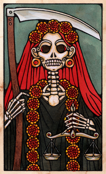 Santa Muerte, ‘Saint Death’, or ‘Holy Death’, is a folk saint of contemporary Mexican Catholicism Who is also called Nuestra Señora de la Santa Muerte, ‘Our Lady of Holy Death’. She is a personification of death, usually depicted as a female skeleton clad in flowing robes and holding a scythe, much like the Grim Reaper. She has a large variety of powers, and can be prayed to for just about anything; She has an especial reputation for granting miracles. Santa Muerte has Her roots in the Aztec Goddess Mictecacihuatl (Whose name means ‘Lady of Death’); She and Her husband Mictlantecutli rule over the lowest of the Underworld realms, Mictlan, where They watch over the bones and souls of the dead. Mictecacihuatl was often depicted in Aztec art with somewhat skeletal facial features, claws like an owl, or wearing a garland of skulls. Santa Muerte can be shown with a variety of objects, symbolizing many different things—while the scythe of course is a symbol of death, it also represents prosperity as it is used during harvest time. Other common objects Santa Muerte holds can include the globe, to show that death is ubiquitous, and the scales, which signify that we are all equal, as death takes us all. She can also be shown with Mictecacihuatl’s owl, representing wisdom and the ability to see in the dark. Santa Muerte is mostly honored in Mexico and other parts of Central America and the United States, but Her worship has begun to spread to the rest of the world. Though She is not an official saint in the Catholic church, She is honored on the first and second of November, the famous Día de los Muertos or Day of the Dead celebration. Done as a commission. This design is available on prints through ArtPal. |